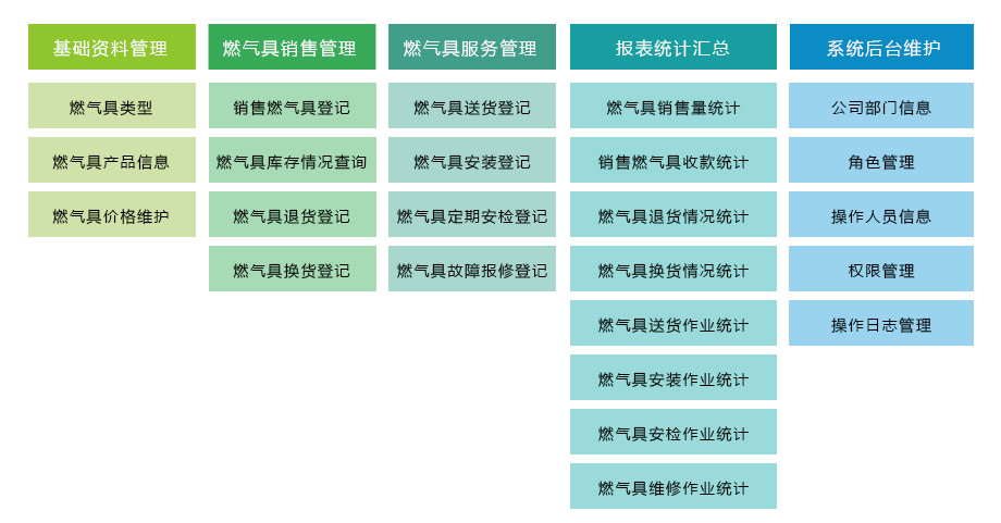 智允燃气信息管理软件系统包括:燃气客服收费系统、燃气自助服务终端、燃气移动业务管理系统、燃气门户网站、燃气网上营业厅、燃气办公OA系统、燃气仓储物资管理系统、燃气管网地理信息系统、天然气输配系统、燃气工程管理系统、燃气微信公众号、燃气安全管理系统、燃气报装系统等。