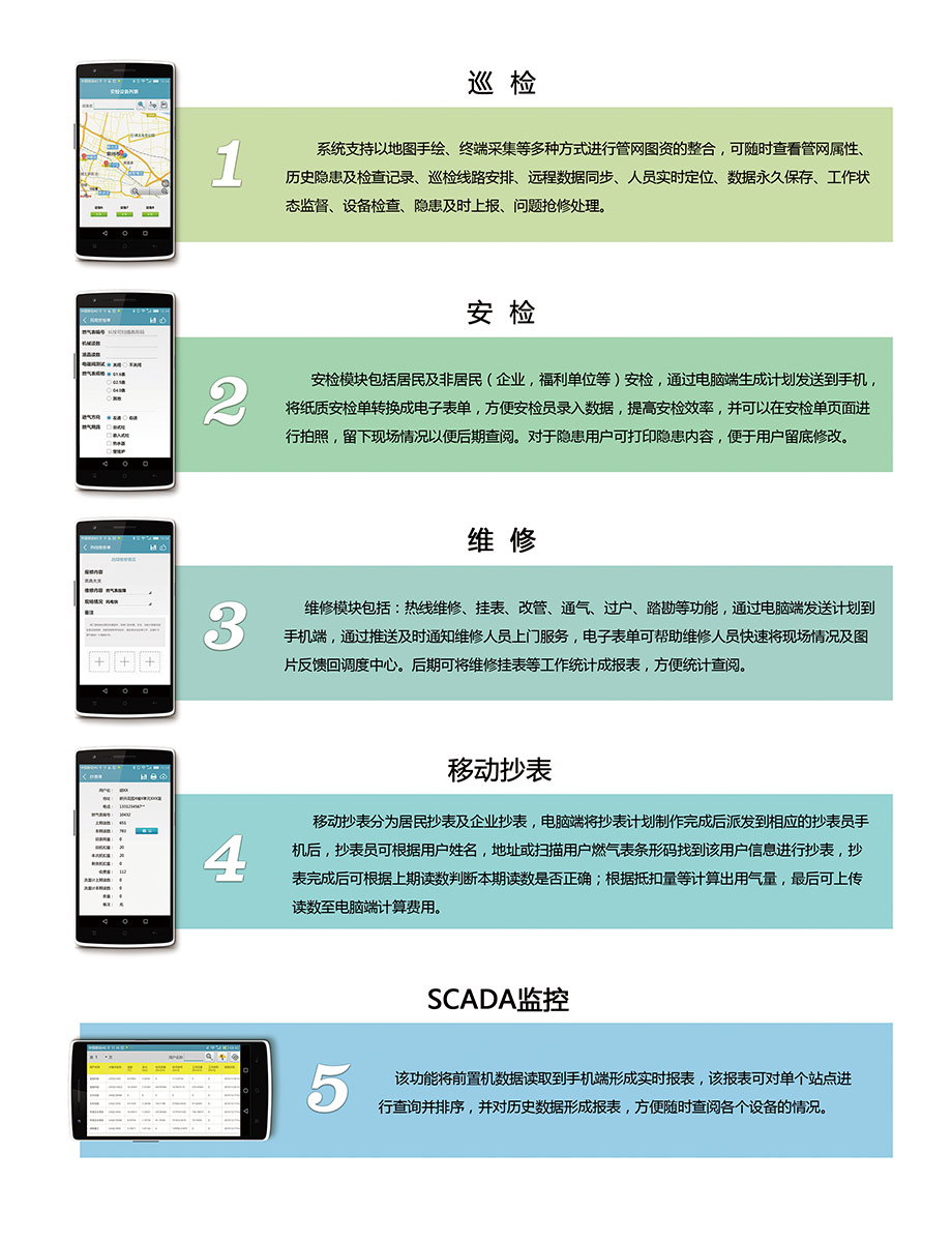 燃气移动业务管理系统是以移动端安检、维修、抄表、报表、巡检业务为基础,乃至扩展至燃气公司业务部门,系统由多个子系统组成:安检(民用安检、工商用户移动安检)、维修(热线维修、挂表、改管、调度、通气、过户、踏勘)、巡检(移动端管线录制,巡检隐患上报及处理,设备巡检、巡检日志、调压柜检查)、第三方施工管理、移动考勤、SCADA监控等,共同完成客户服务相关的各项工作。