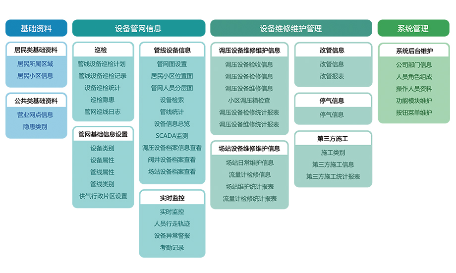 智允燃气信息管理软件系统包括:燃气客服收费系统、燃气自助服务终端、燃气移动业务管理系统、燃气门户网站、燃气网上营业厅、燃气办公OA系统、燃气仓储物资管理系统、燃气管网地理信息系统、天然气输配系统、燃气工程管理系统、燃气微信公众号、燃气安全管理系统、燃气报装系统等。